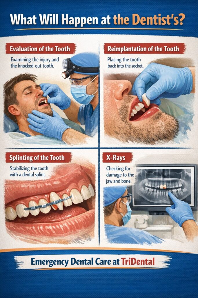When you arrive at TriDental with a knocked-out tooth, our emergency dentist will quickly assess your situation and take steps that maximize your tooth’s chances for recovery. Each step is vital: